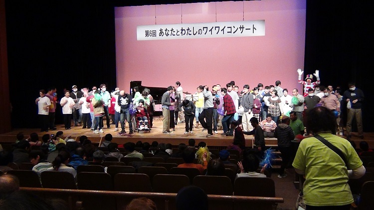 その122 障害児者 160人 スタッフ 130人 お客様 180人 合計 470人でした。 ほとんど 500人の会場がいっぱいになりました。 第6回ということで 招待施設も増えました。特に重度の麻痺の方の参加が多くあまりお出かけができないので ステージに上がっていただいたのがご家族様施設職員の方からとても 好評をいただきました。 実行委員もとてもうれしく思いました。 その際 君津のボーイいスカウトのメンバー 君津中学の合唱部の皆さんに、ステージでお手伝い頂き 心温まるものになりました。