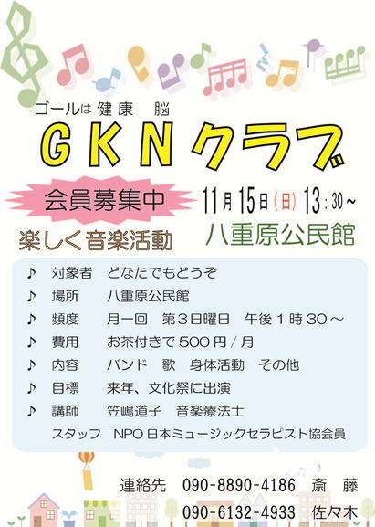 歌が始まると 病室から 出てきて 聞いています。 やっぱプロ は違います。看護師さんもきいています。 ハッピイ な一日でした。患者様にとっても 私たちスタッフにとっても。 雨の多い秋です。11月26日 その130 GKNクラブのお話し 会長は私の弟子 42歳の斎藤真由美、 会計は70代の 男性、楽譜係 は70代の女性、 参加者は 親子が3組 ご夫婦が一組 施設経営者、ドラムサークル愛好者 50代女性、お花の先生、ピアノ教師、音楽療法研修者など、在籍20名をこえました。